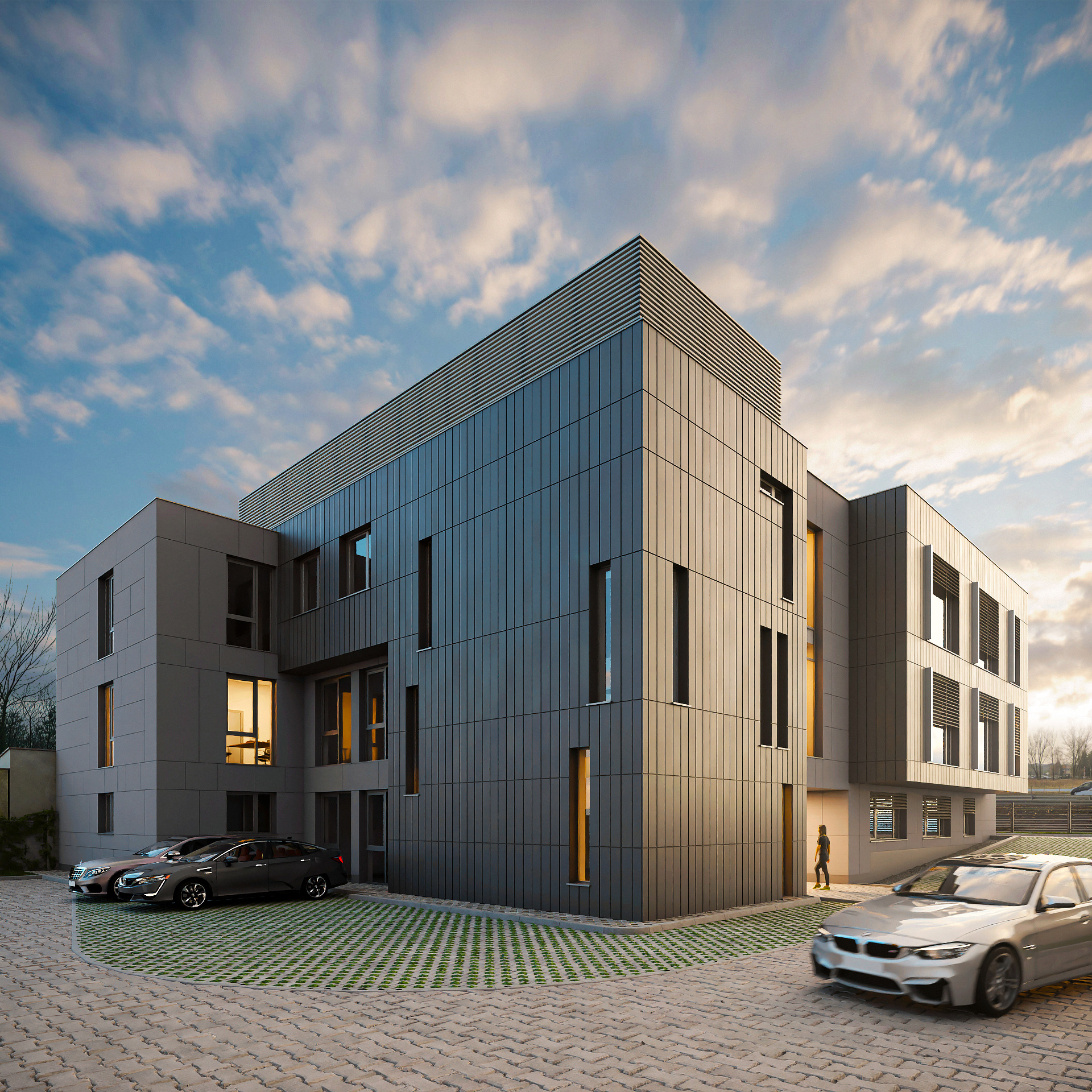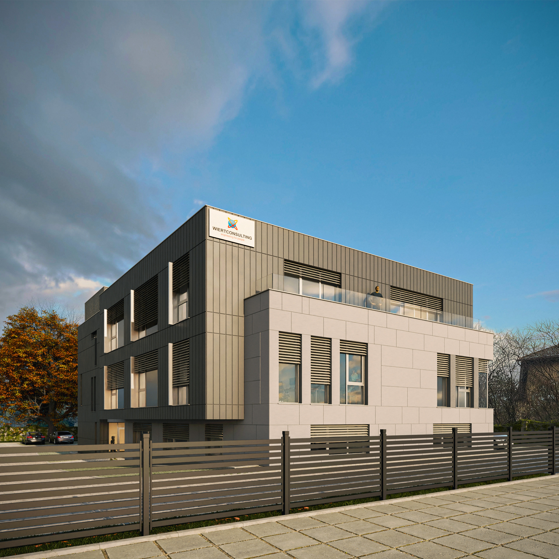 2 fotorealistyczne wizualizacje budynku biurowego w Poznaniu wykonane dla Autorskiego Biura Projektów "M&G".