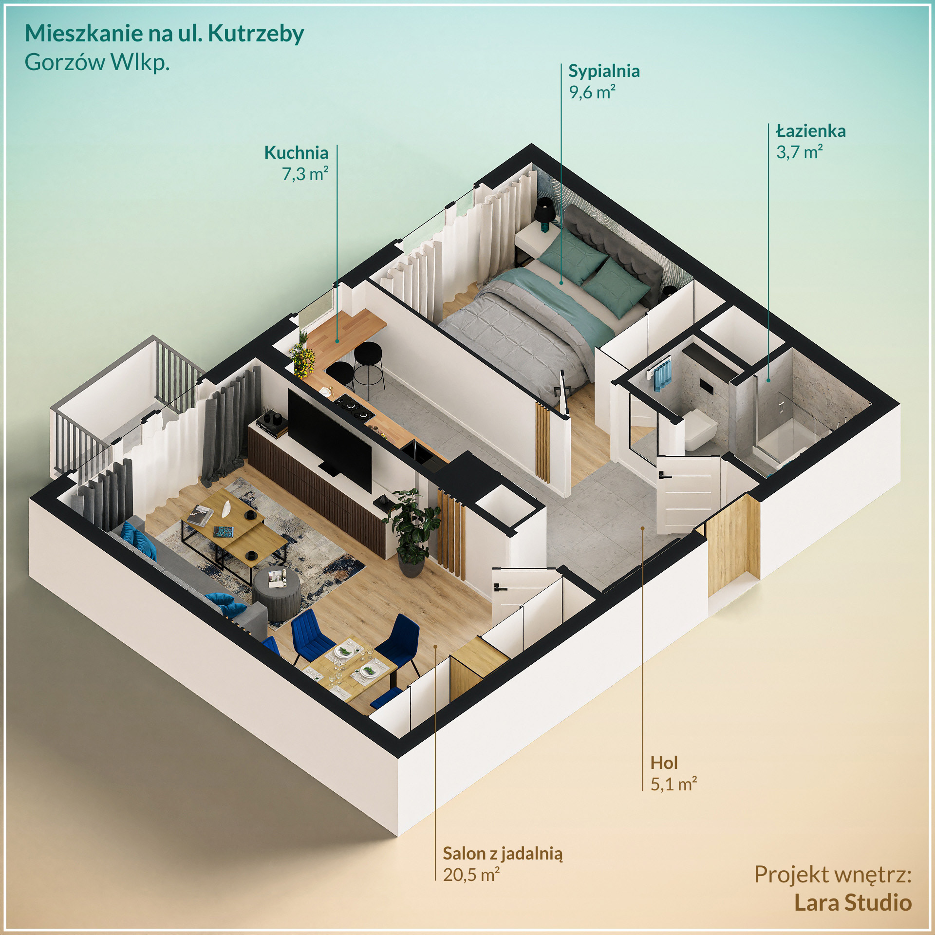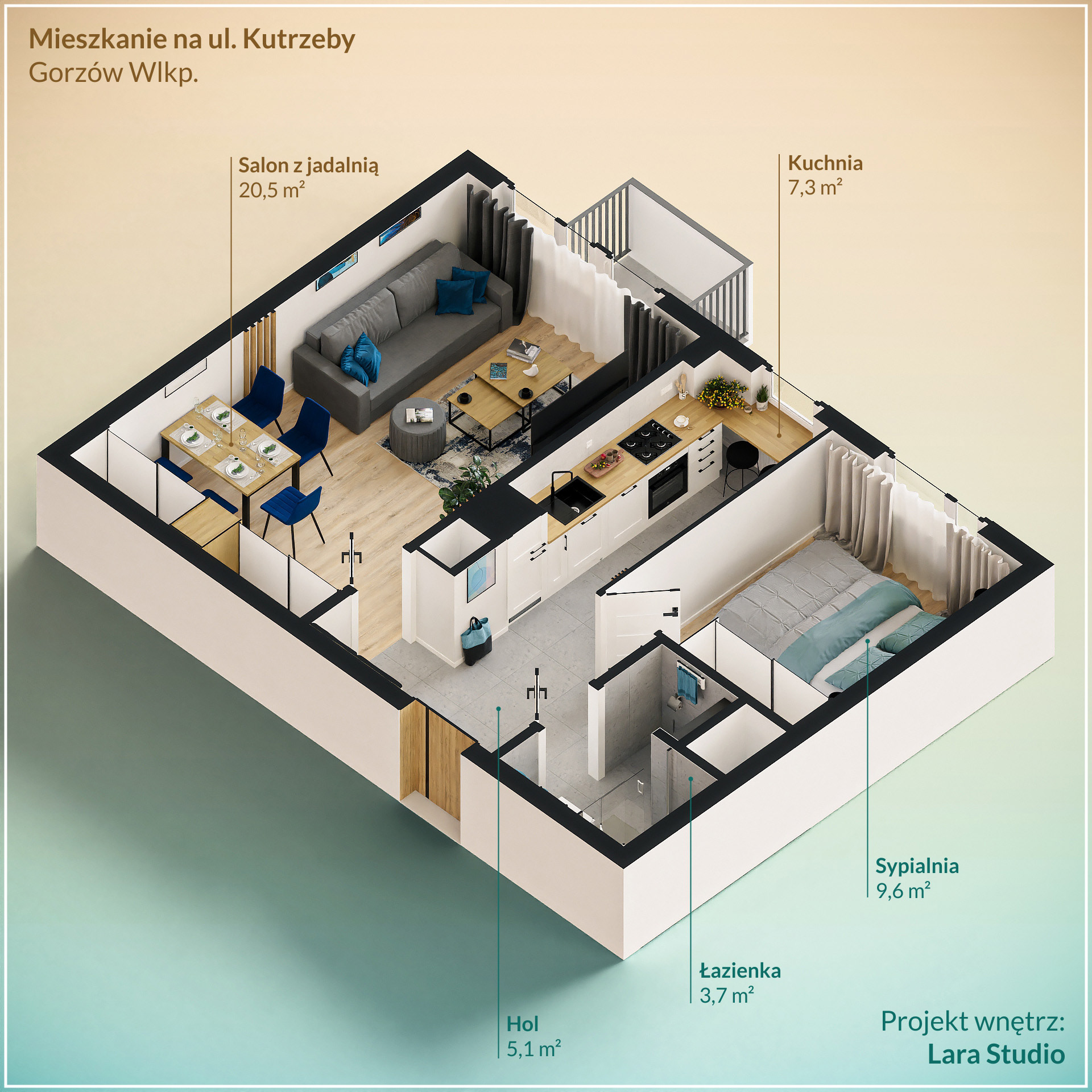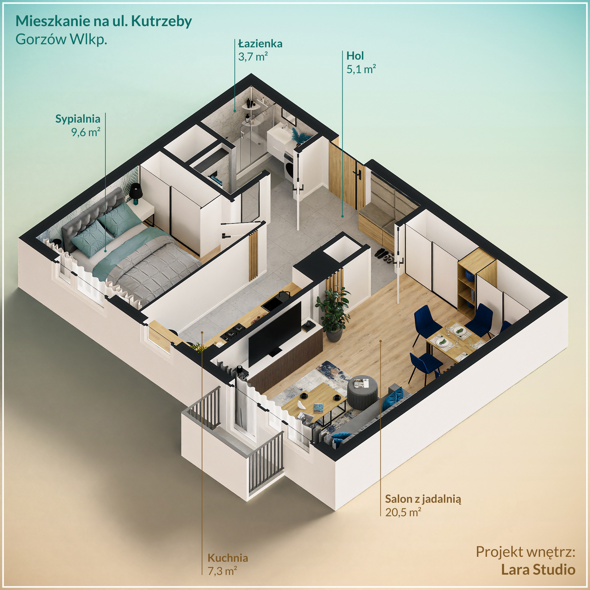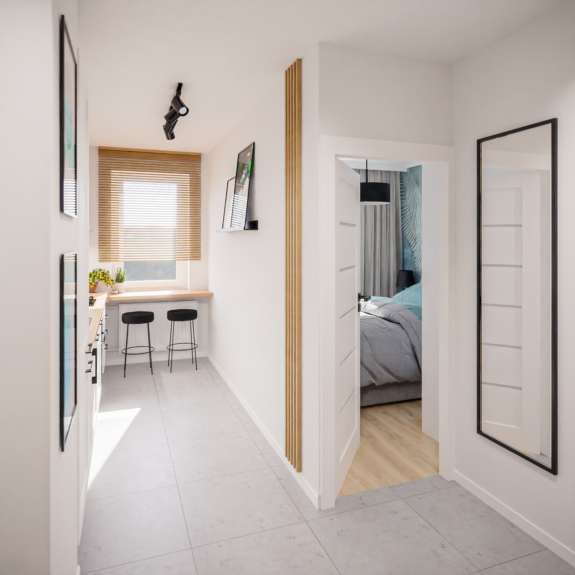 11 fotorealistycznych wizualizacji, 4 widoki aksonometryczne oraz 5 interaktywnych widoków panoramicznych projektu wnętrz mieszkania w Gorzowie Wielkopolskim wykonanych dla Lara Studio.
