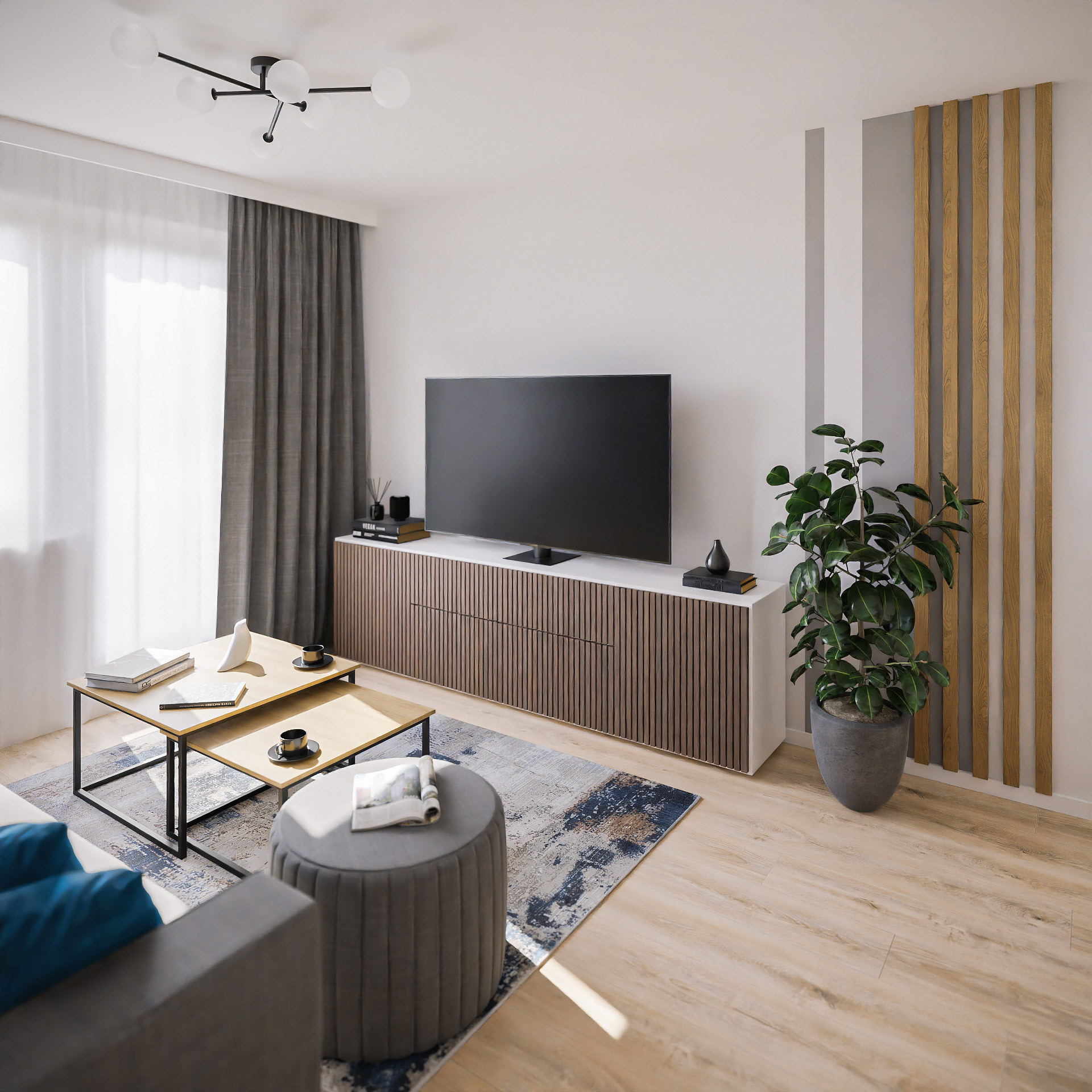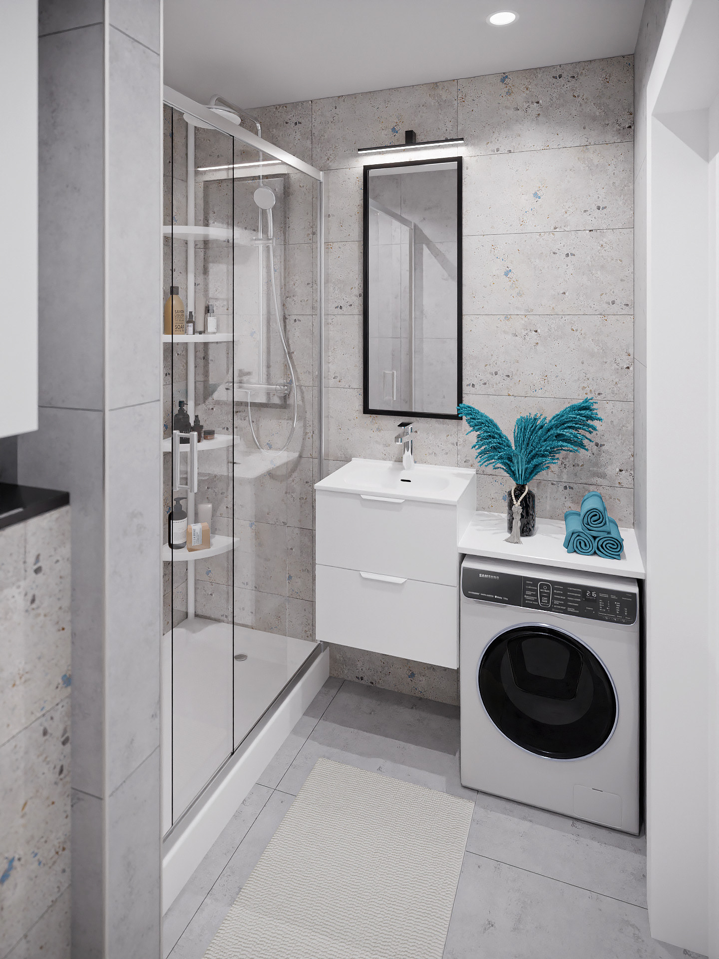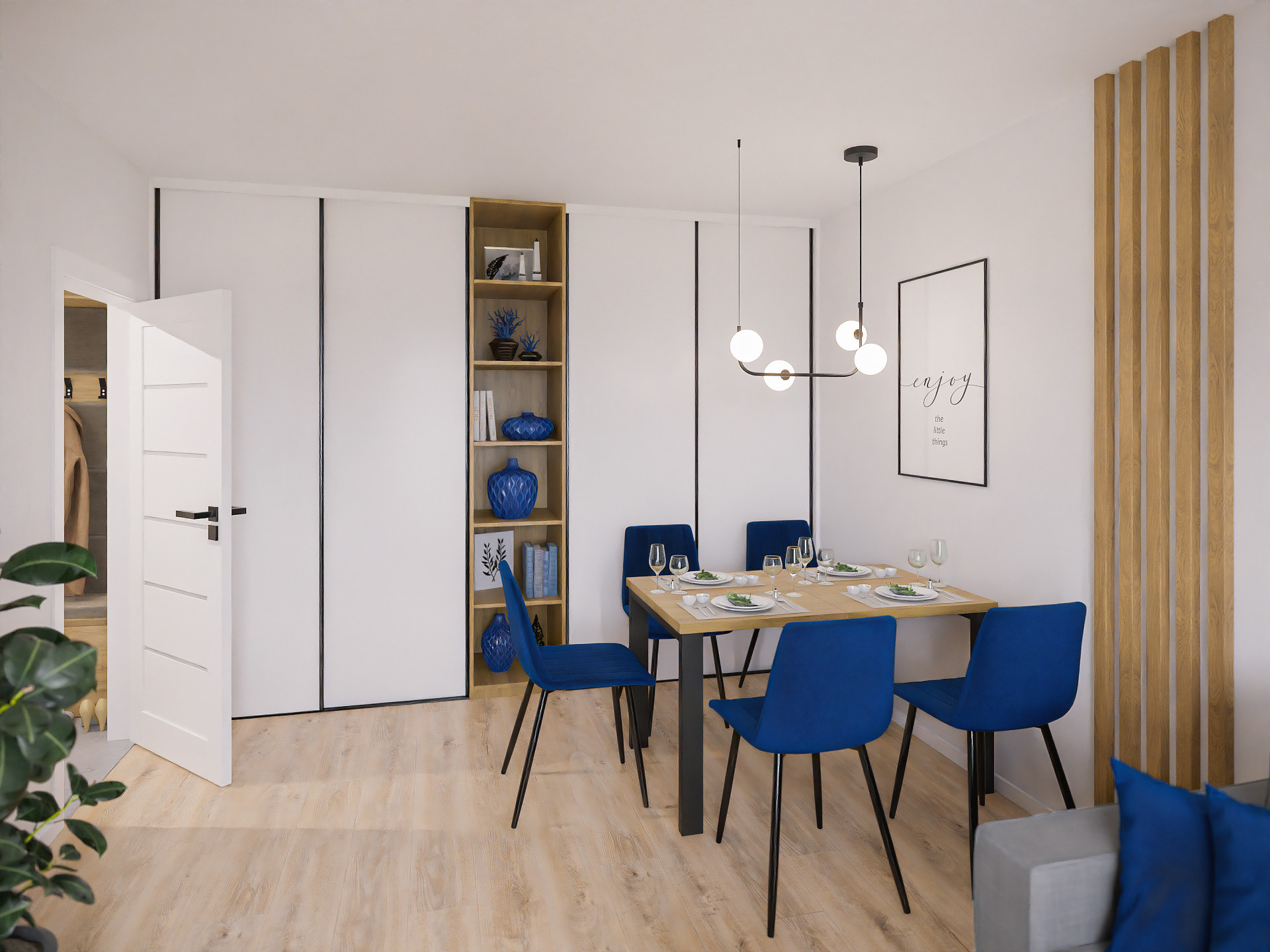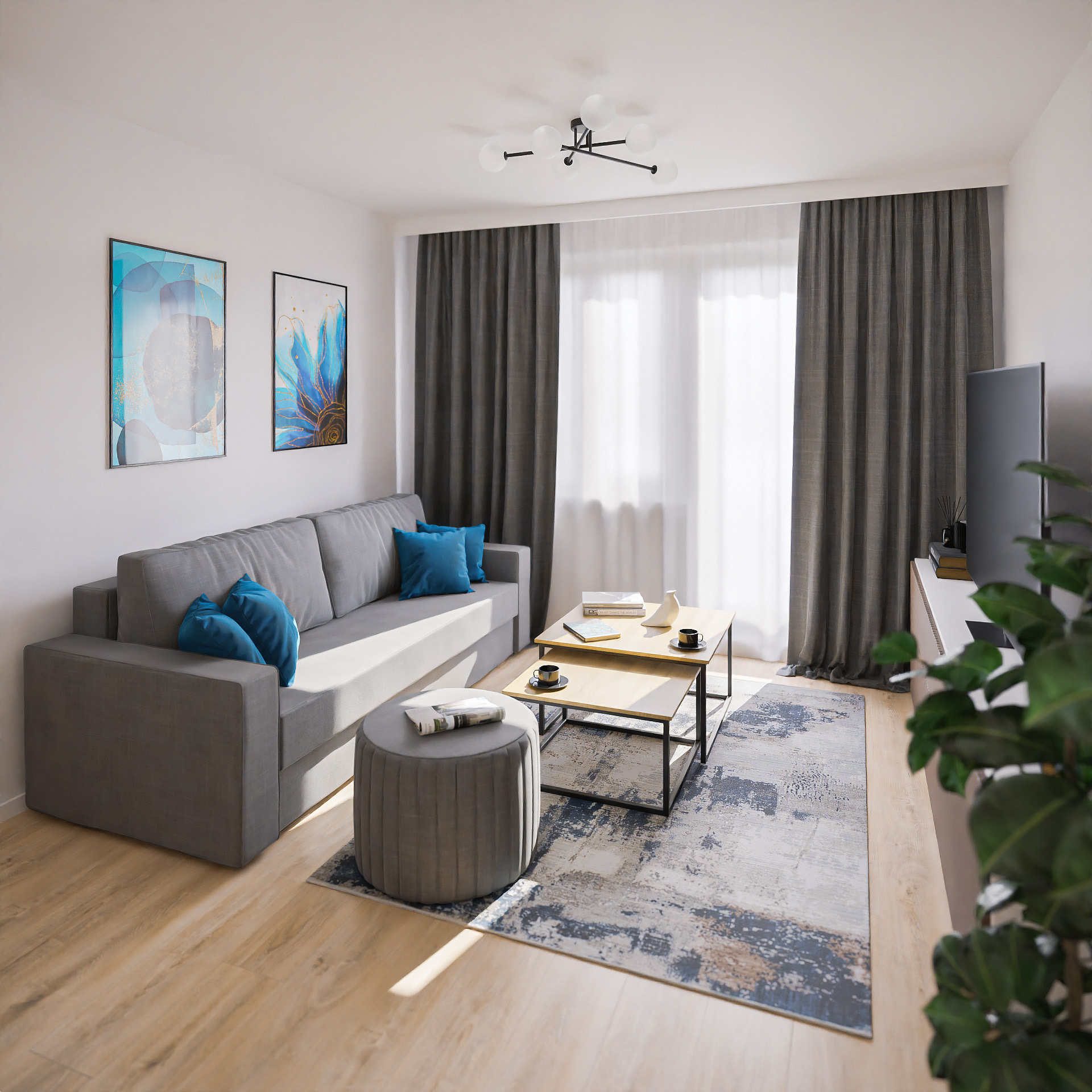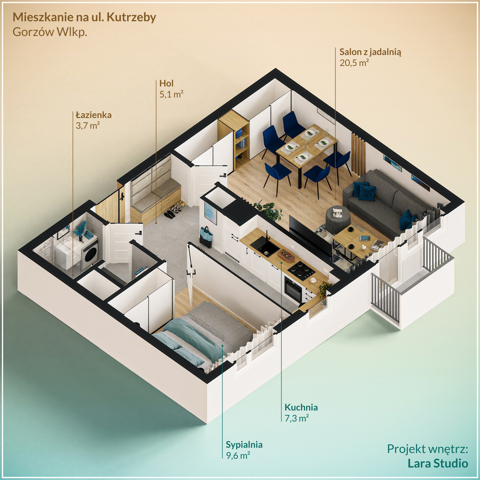 11 fotorealistycznych wizualizacji, 4 widoki aksonometryczne oraz 5 interaktywnych widoków panoramicznych projektu wnętrz mieszkania w Gorzowie Wielkopolskim wykonanych dla Lara Studio.