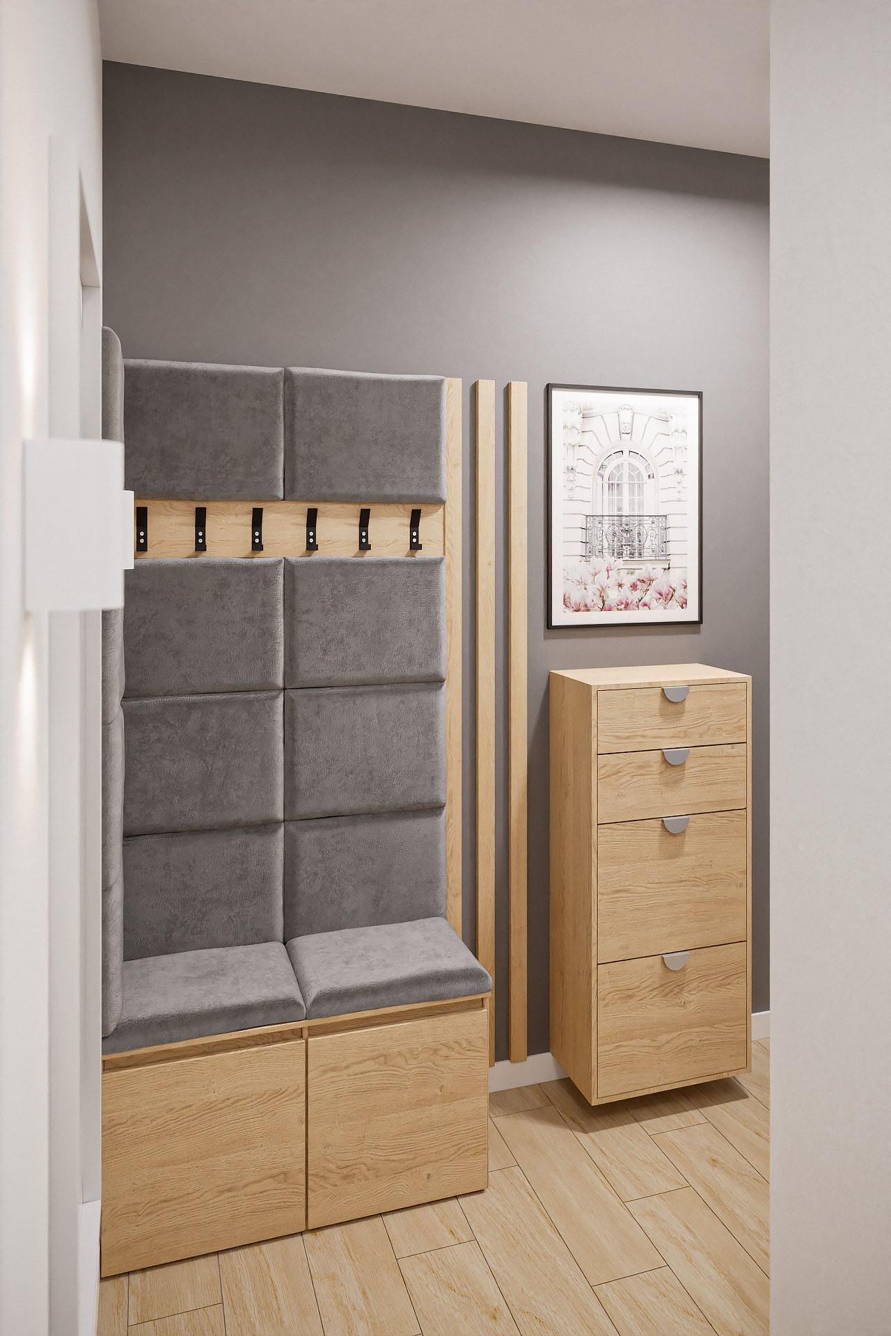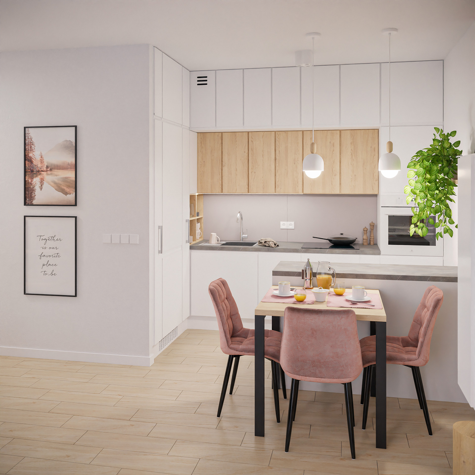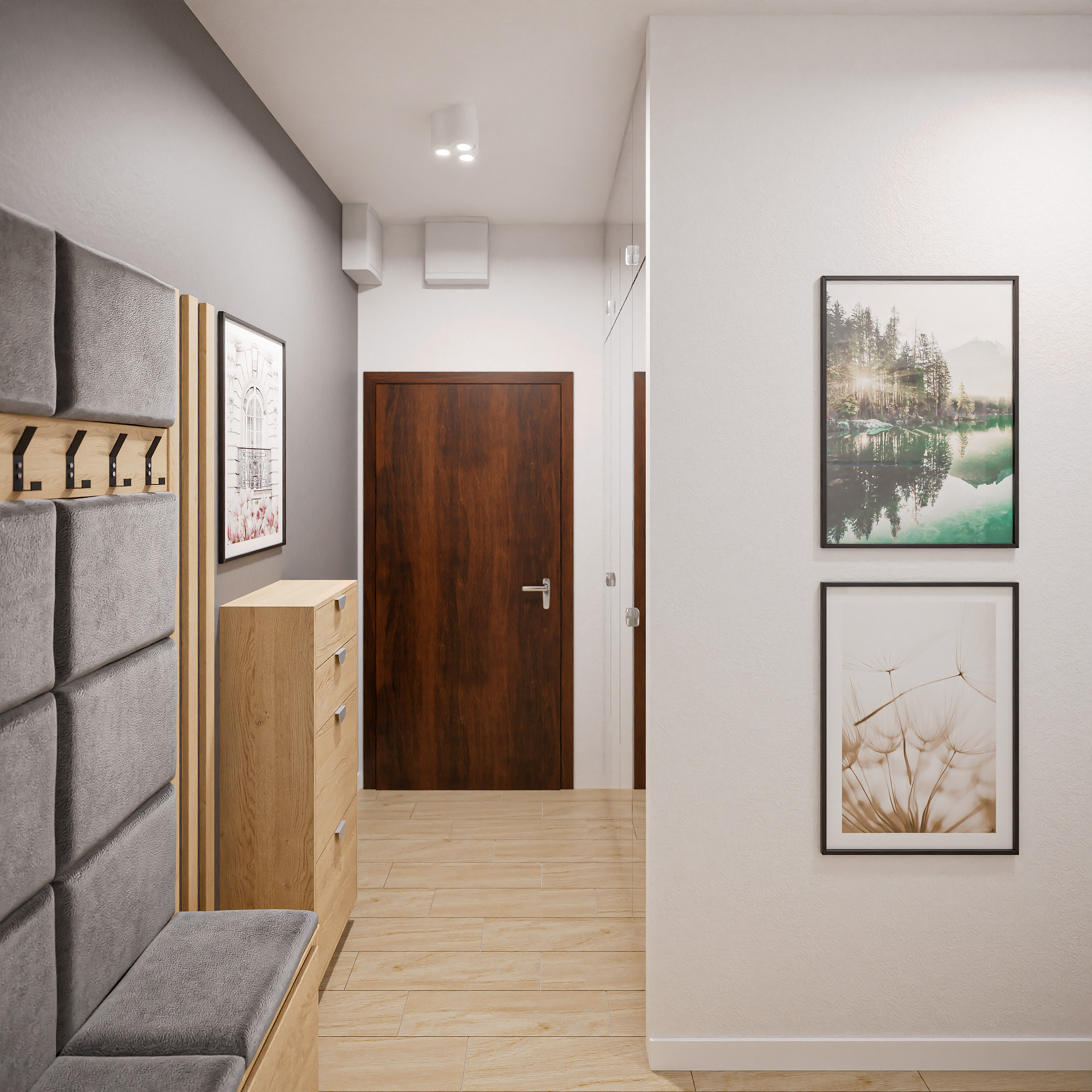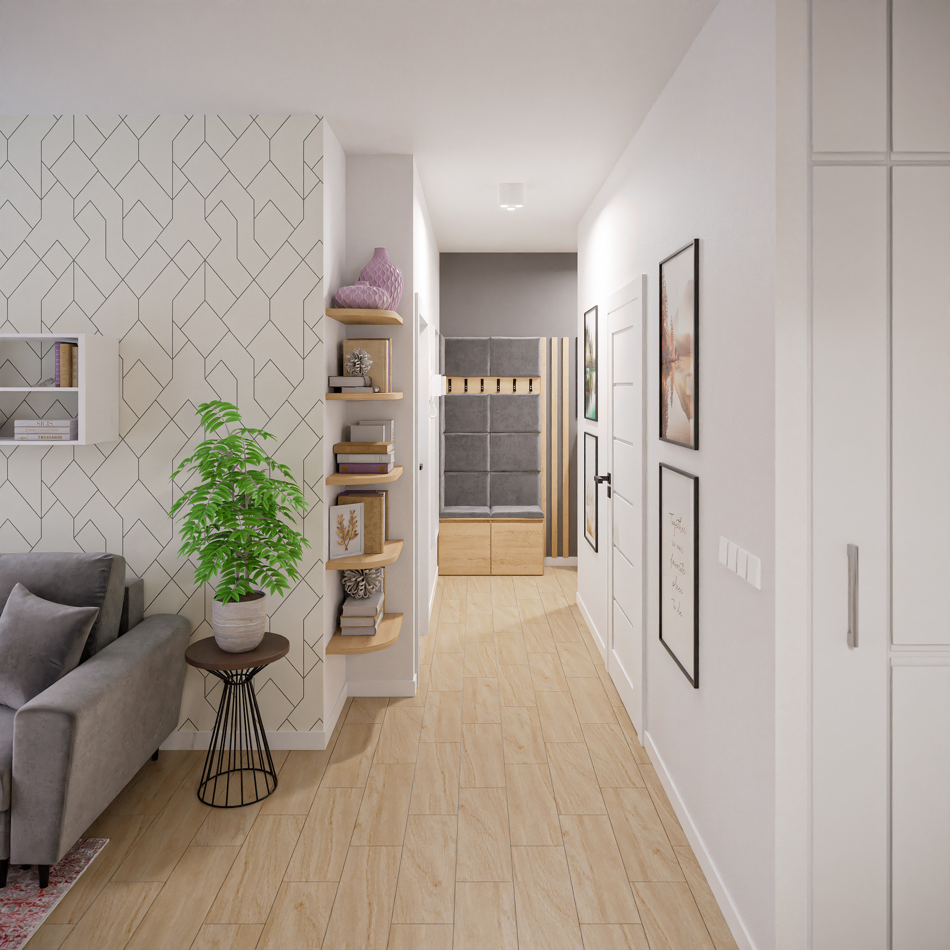 14 fotorealistycznych wizualizacji projektu wnętrz mieszkania w Siechnicach wykonanych dla Lara Studio.